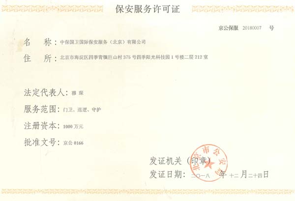 中保國衛(wèi)國際保安服務(wù)(北京)有限公司,屬中保國衛(wèi)集團旗下子公司。能全方位的為大型客戶提供優(yōu)質(zhì)的安保、押運服務(wù),是集人防和技防于一體的新型正規(guī)化綜合安保押運服務(wù)企業(yè),提供人防、物防、技防、聯(lián)網(wǎng)報*、非武裝押運等安防相關(guān)的一站式服務(wù)。 公司在國內(nèi)多省設(shè)立有分公司及分支機構(gòu),著重提升安全押運、智能技術(shù)押運及安全技術(shù)防范相關(guān)的服務(wù),業(yè)務(wù)范圍覆蓋全國一、二線城市、港澳地區(qū)以及海外地區(qū)。安保方面主要為政府機構(gòu)、金融機構(gòu)、企事業(yè)單位、醫(yī)療衛(wèi)生、高等院校、工業(yè)園區(qū)、大型商場、高檔住宅、智能商務(wù)樓、大型活動提供門衛(wèi)、守護、巡邏、押運(非武裝)、安全檢查、保安特勤、私人護衛(wèi)、消防中控、安全技術(shù)防范、遠洋護航等全方位服務(wù),同時面向國際市場,為中資企業(yè)在“一帶一路”沿線國家投資提供境外安保服務(wù)。 >> 更多內(nèi)容 |